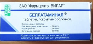 - В состав лекарственного средства входят алкалоиды красавки в количестве 100мкг, эрготамина тартрат — 300мкг и фенобарбитал — 20 мг.