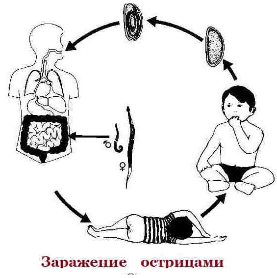 Заражение яйцами гельминтов данной разновидности происходит, в основном, контактно-бытовым путем — через постель, предметы гигиены, детские игрушки, мебель, одежду и т. д. Разносчиками паразитов в большинстве случаев являются мухи. Путем заражения острицами может стать: