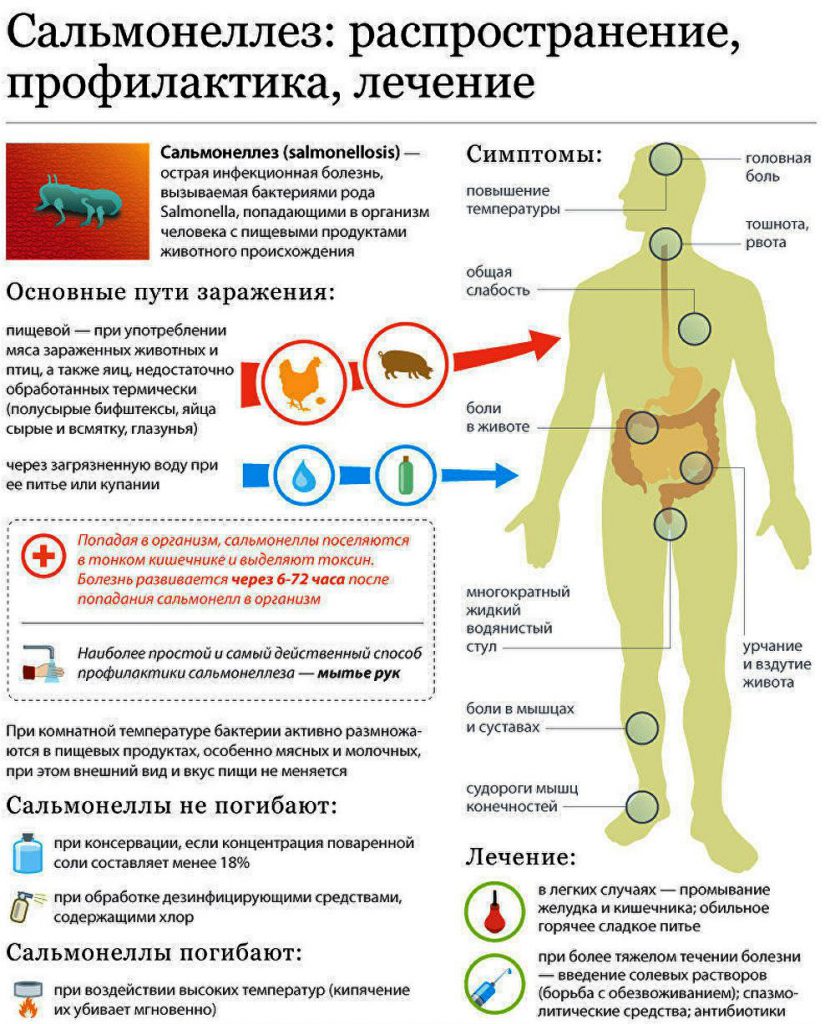 При проникновении в кровь сальмонеллы начинают распространяться по организму, обсеменяя внутренние органы и ткани. Человек может подхватить инфекцию при уходе за животным, разделке мяса или употреблении его в пищу. Птицы, зараженные сальмонеллой, загрязняют внешнюю среду пометом, при контакте с которым человек тоже инфицируется. Но далеко не всегда переносчиками этих микроорганизмов являются животные — люди тоже могут переносить инфекцию. Животные могут быть переносчиками сальмонеллы в течение нескольких месяцев, люди — от 3 недель до нескольких лет.